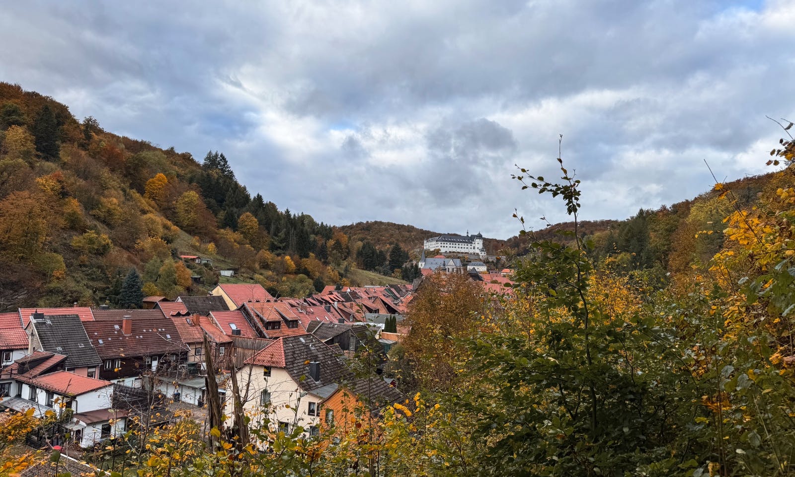 Wenn du das Schloss von außen bewundern möchtest, haben wir einen besonderen Tipp: unsere Panoramatour rund um Stolberg. Die knapp fünf Kilometer lange Runde führt durch Laubwald, kleine Pfade und bietet gleich mehrere fantastische Ausblicke auf das Schloss, besonders im Herbst, wenn das Licht golden ist und die Stadt unten im Tal fast märchenhaft wirkt.