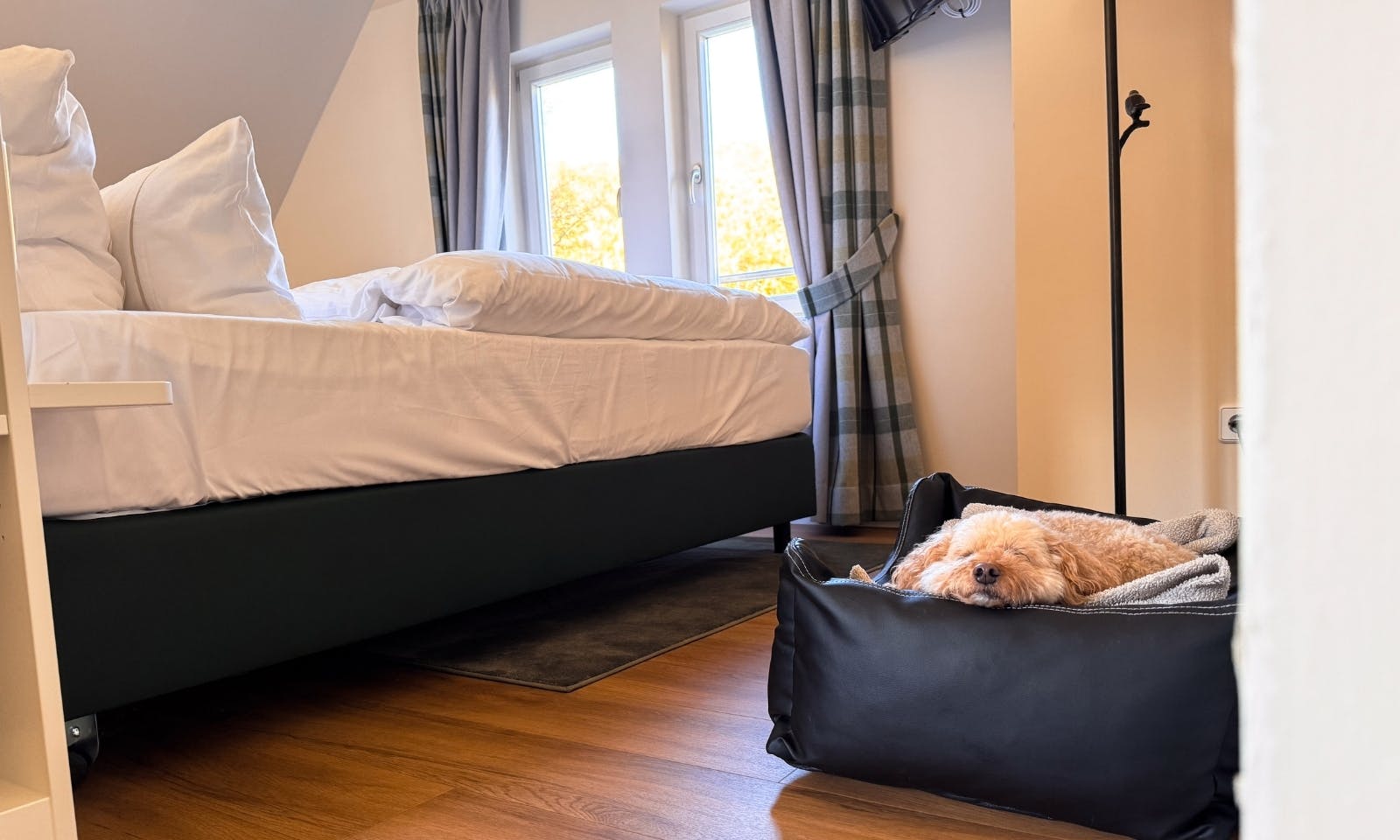 Hunde sind in ausgewählten Zimmern, insbesondere im Kutscherhaus, herzlich willkommen. Dort gibt es Näpfe, Körbchen und kleine Extras, die zeigen, dass hier mitgedacht wird. In den Private Spa Suiten und im Wellnessbereich sind Hunde allerdings nicht erlaubt, was wir nachvollziehbar finden, da diese Bereiche allergikerfreundlich konzipiert sind. Dafür bietet das FreiWerk gute Kompromisse: Frühstück und Abendessen können zum Beispiel in der Lobby eingenommen werden, wo dein Hund entspannt mit dir bleiben darf.